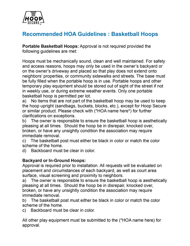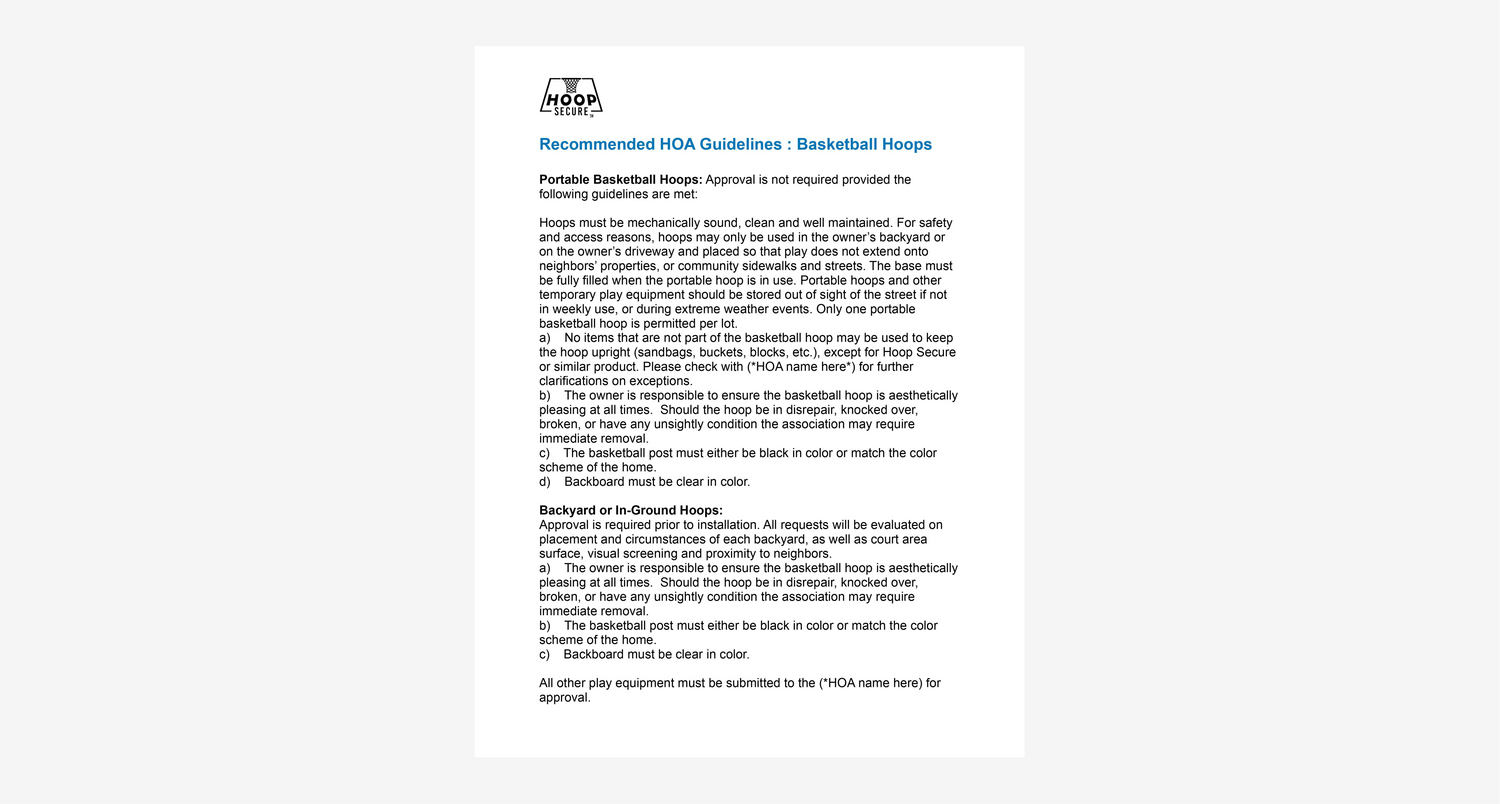 RECOMMENDATION:Eliminate the headaches of portable basketball hoop management for your community. Download our covenant language recommendations and compare to yours to see how easy a change can be to avoid managing violations, incurring additional costs while creating a cleaner, safer community with Hoop Secure™.